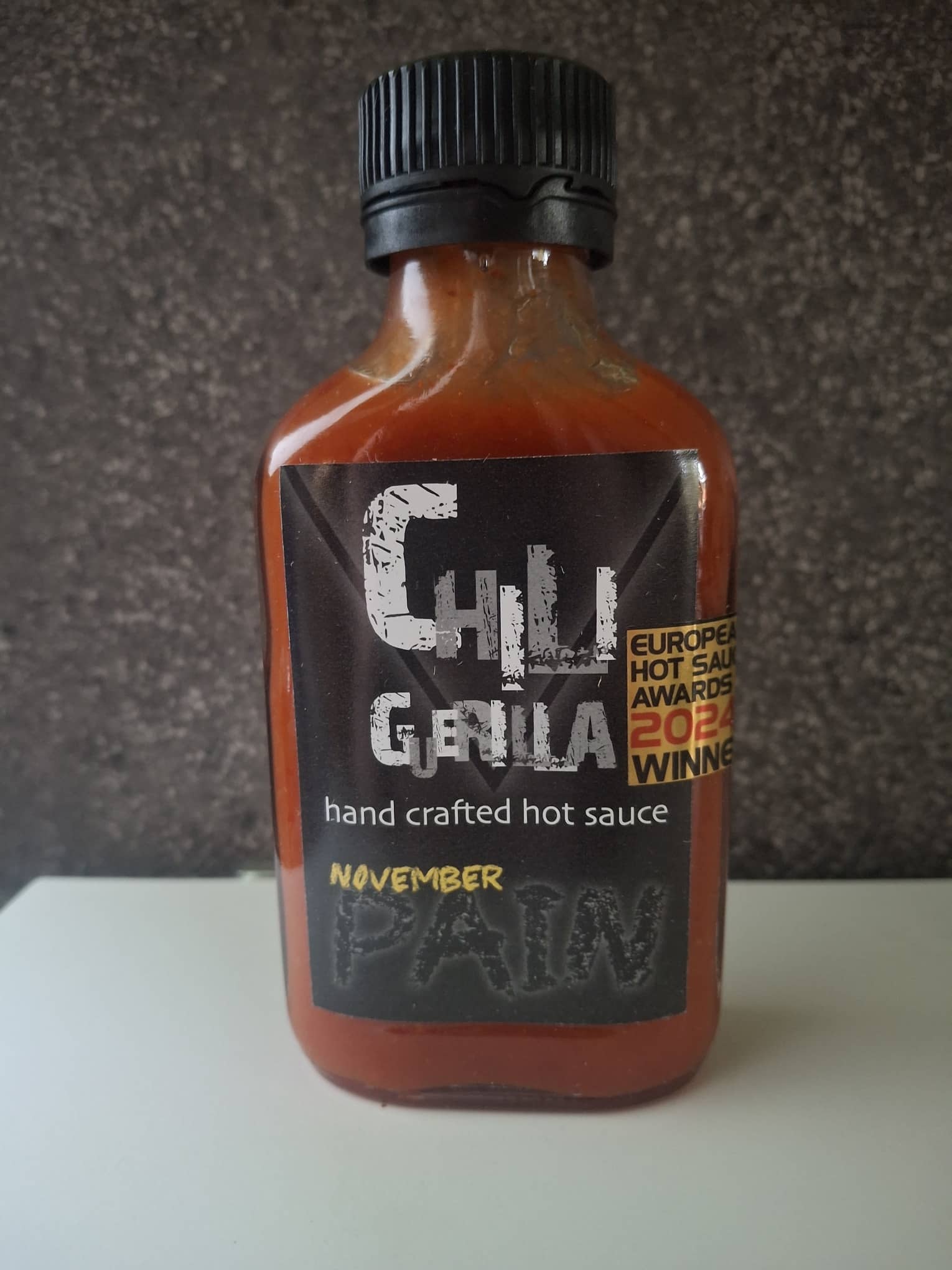 HerstellerChiliguerilla Link zum Produkthttps://shop.chiliguerilla.com/produkt/november-pain-24-chiliguerilla-hand-crafted-hot-sauce-100ml-14-95EUR-100ml Inhalt100mL ZutatenChilis (Ghost Pepper, Carolina Reaper, Rawit,