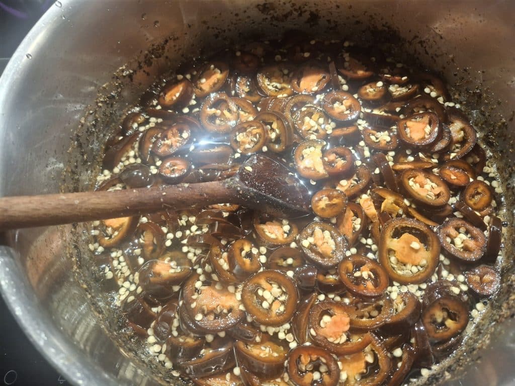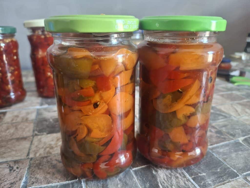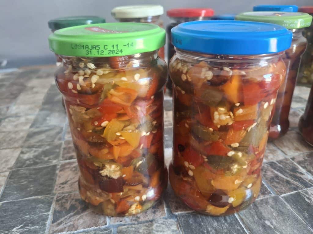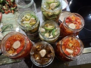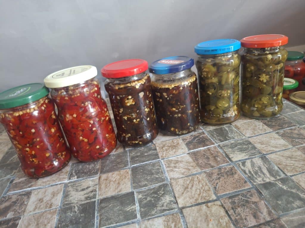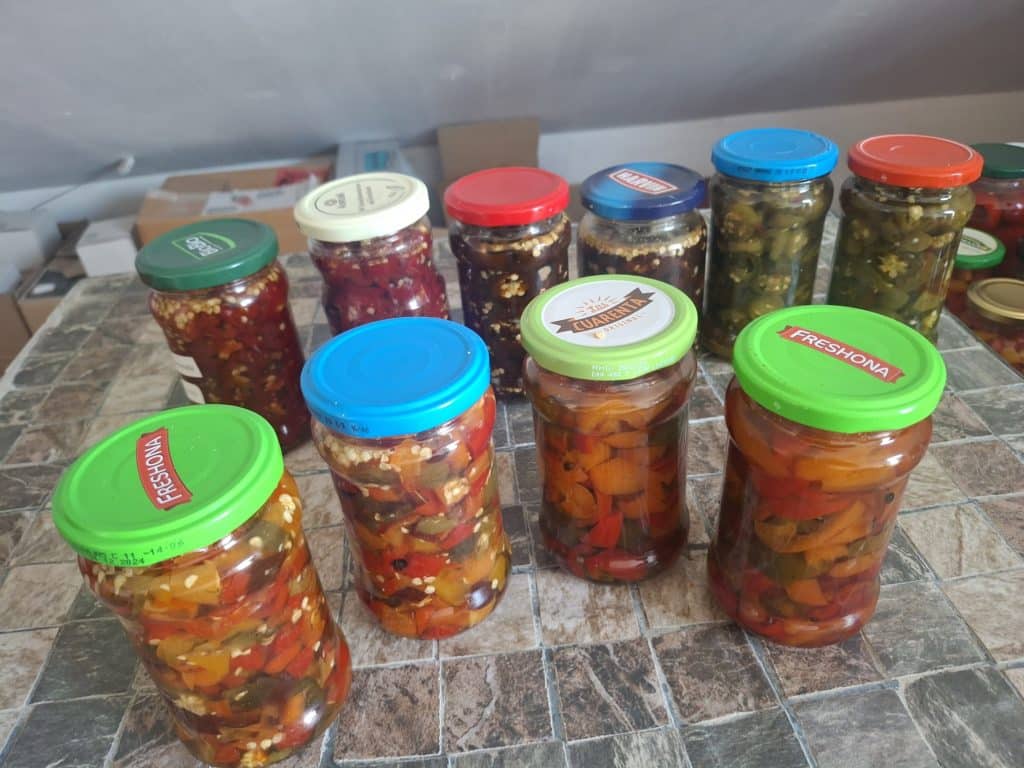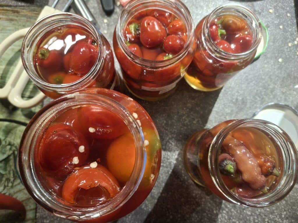 Los ging es Mitte Oktober mit der Herstellung von Cowboy Candy aus der braunen Jalapenosorte Azabache und aus verschiedenen rot gereiften Jalapenos. Sowie süß sauer eingelegten Biquinhos, Aji Cereza, Buena Mulata und Tondo Calabrese zum Füllen.
