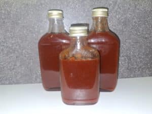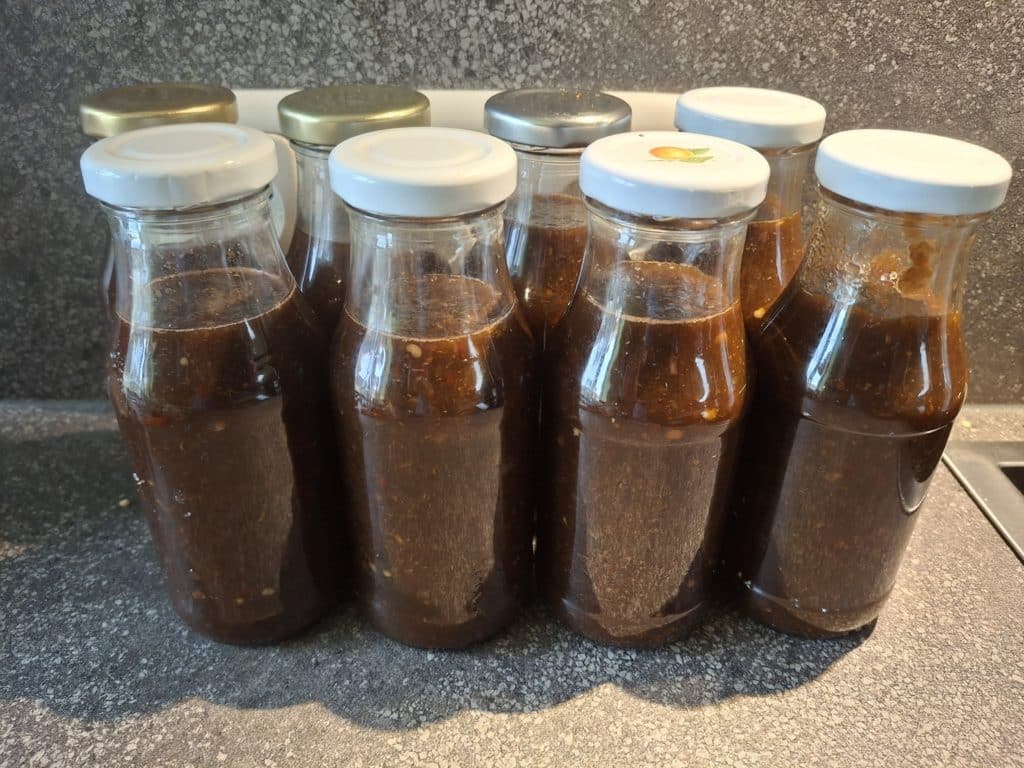 Etwa zeitgleich 8 Flaschen von meiner Smoky Grapejala. Grüne Jalapenos und Rocoto Ecuadorian Sweet über Orangenholz kalt geräuchert und zusammen mit Grapefruitsaft, Limettensaft, Balsamico und Zucker zu Sweet Chilisauce-Konsistenz einreduziert. Genaues Rezept ist geheim.