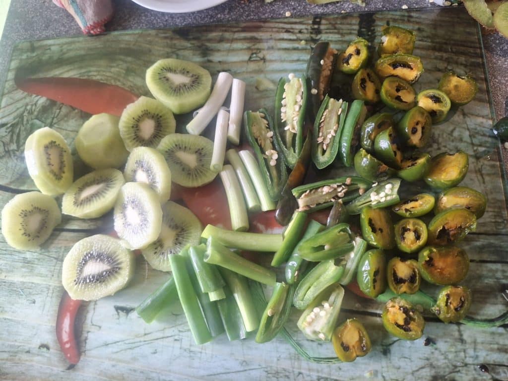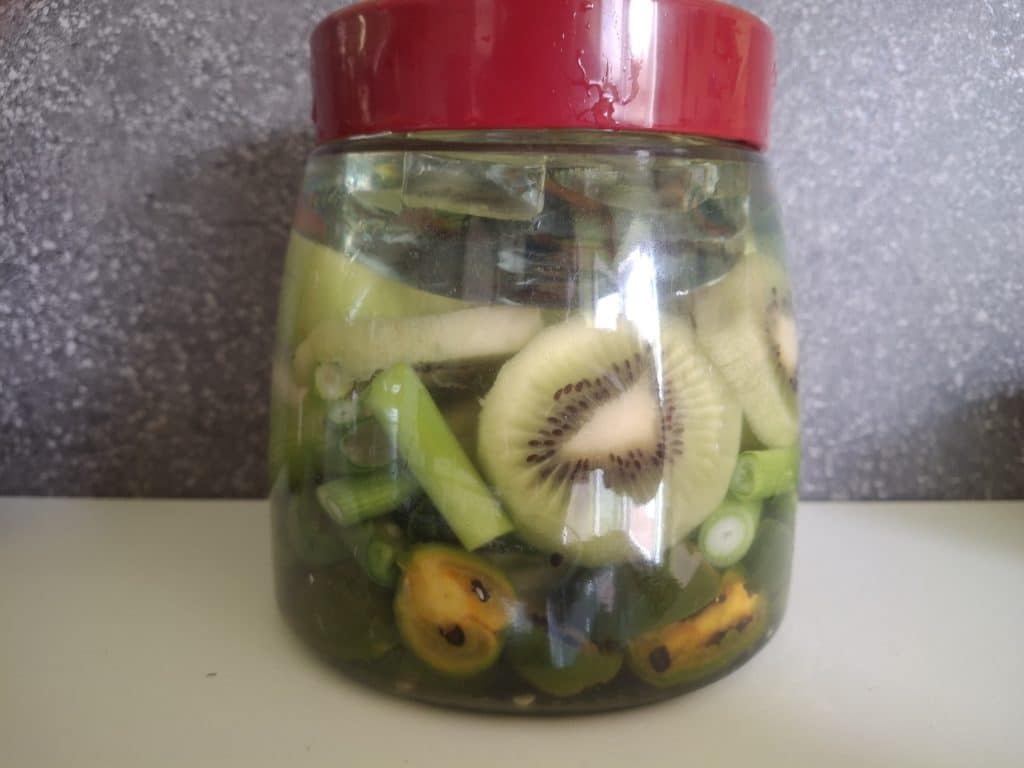 Hotsauce aus fermentierten Kiwis, Frühlingszwiebeln, grünen Jalapenos und Rocoto Olive Mini. Gekocht mit Minze und Limette.
