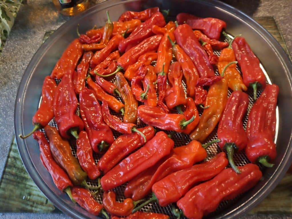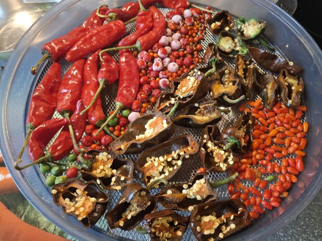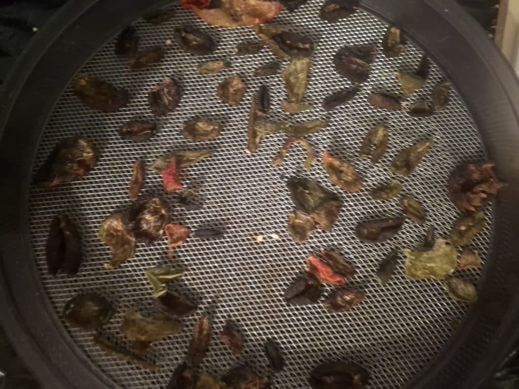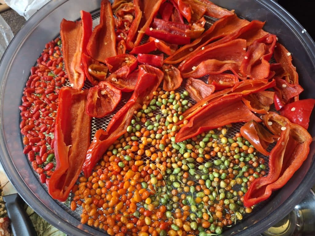 mit 5 Etagen und verschiedene Sorten gedörrt. An Chilis rot gereifte Shishitos (will Peperoni Cruschi draus machen), Puya, NewMexican-Chilis, Puya, Chiltepin, C. Cardenasii, C. praetermissum, Aji Fantasy Striped, Korean Hot, Hallows Eve, Tiberius Mauler Peach und Naga Morich.